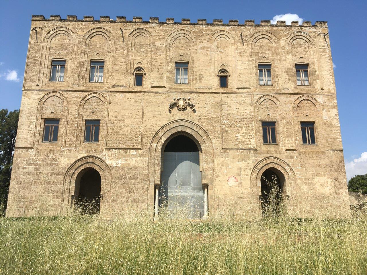 La Zisa castle in Palermo. Got it's name from the Arabic "Aziz" which was Italianized to "Zisa." Did not originally have the crenallations on top; it was modified later because tourists want to see a castle that "looks more medieval." But if you zoom in on the crenallations, you can see that they have Arabic writing on them. The gaps in the writing are annoying! Also, the front is decorated with lions, which King Roger used as his symbol.