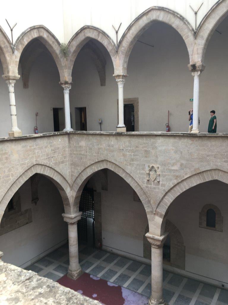 Pointed archs in the Palazzo Chiaramonte Steri in Palermo. This was built a few centuries after Roger's palace but they took inspiration from that "Sicilian" style. Except, the pointed arch technology was an influence from Arab engineers and is harder to pull off.