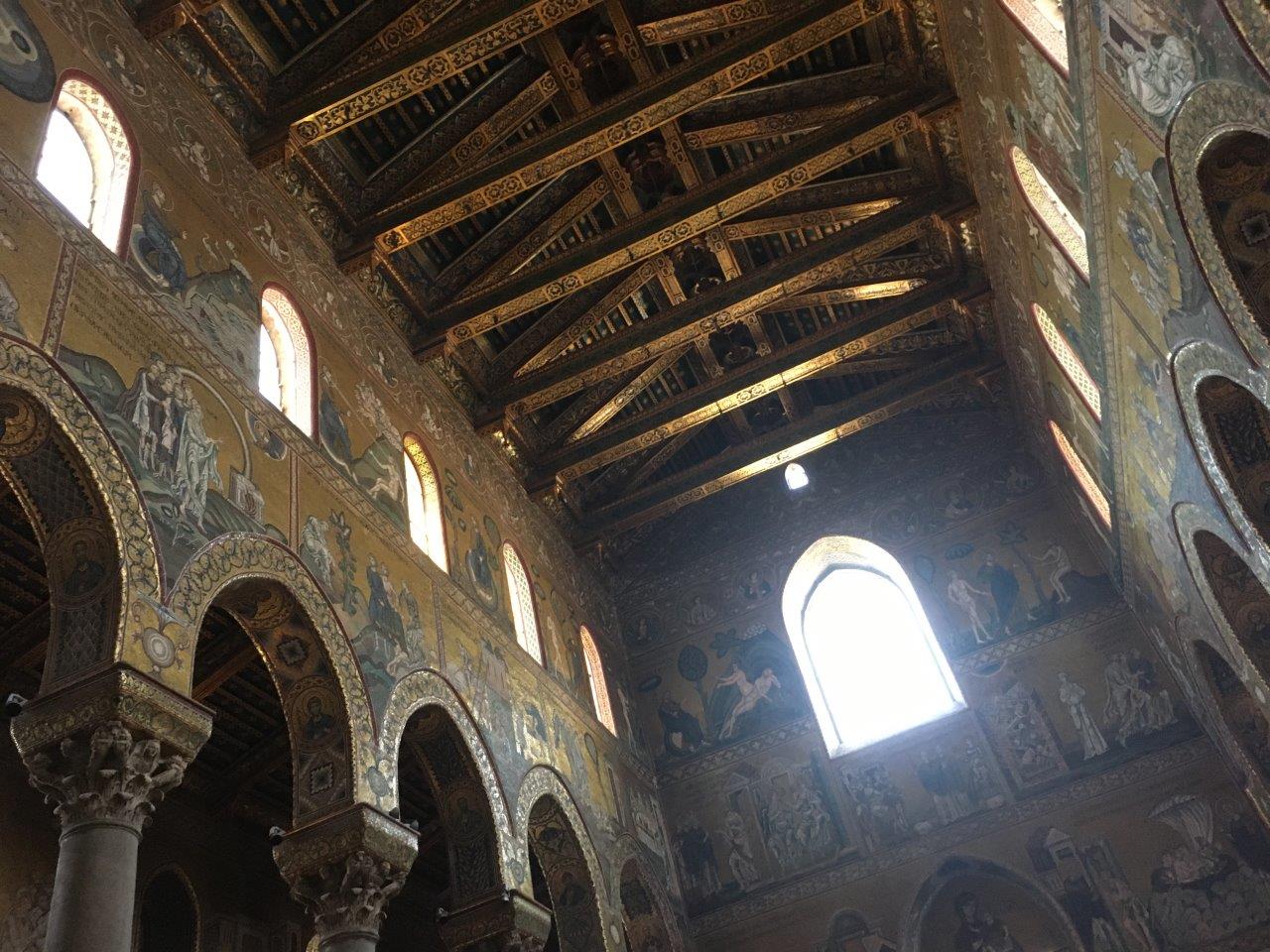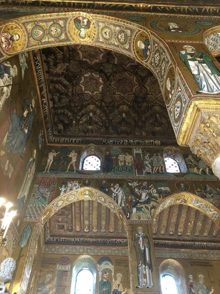 Inside Roger's Palatine Chapel, the Cappella Palatina! Byzantine gold mosaics depicting Biblical stories but a Arab muqarnas ceiling, the only surviving wooden one left in the world! Looks like painted stalactites. They are also covered with Biblical figures but done by Muslim artists who painted them like their own figures. They also wrote Arabic on the ceiling in white, and it reads things like, Roger the Magnificent, he's so great and Allah loves him!