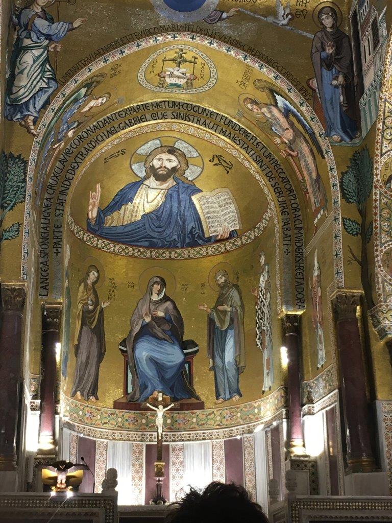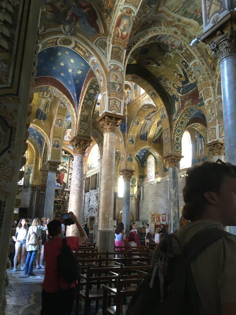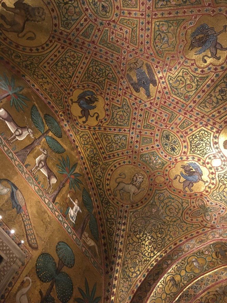 Inside La Martorana! Medieval churches were evidently less about hearing the speeches by the priests and more about the magical atmosphere. The ceiling is such that the choir's voices got echoed around so it seemed like angel ghosts were present. The dark blue represents the sky, as if a portal is opening in the ceiling to connect with the divine.