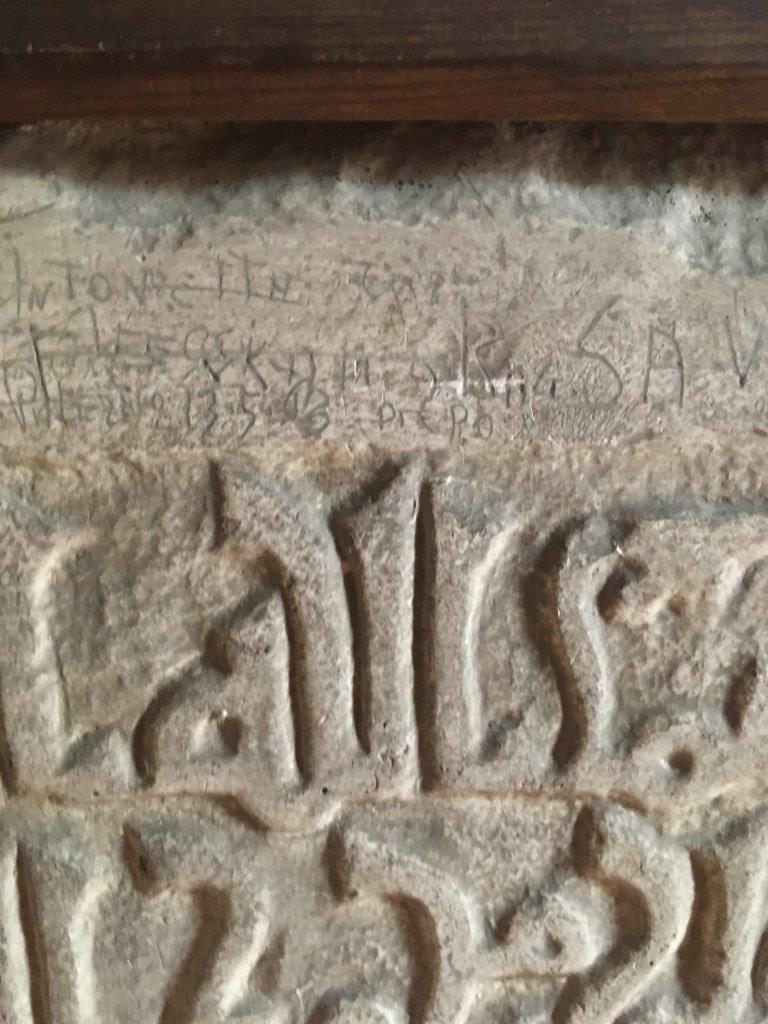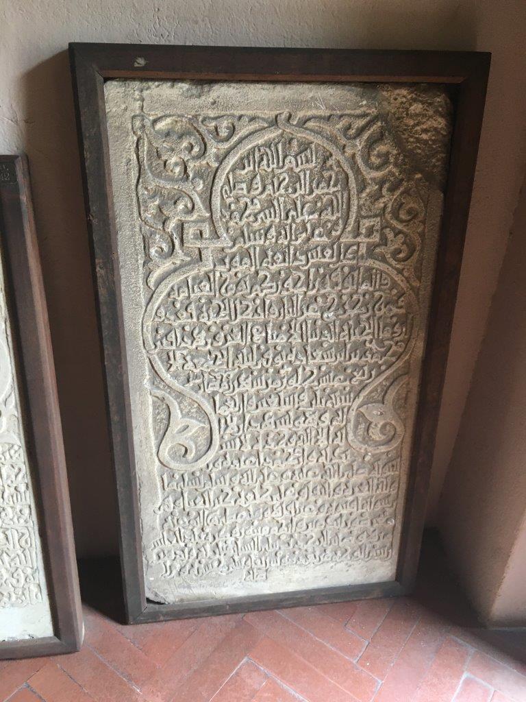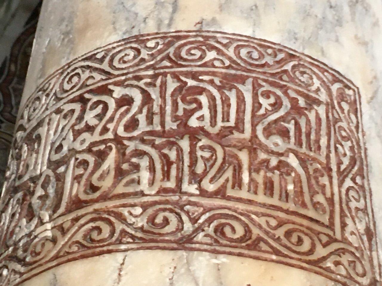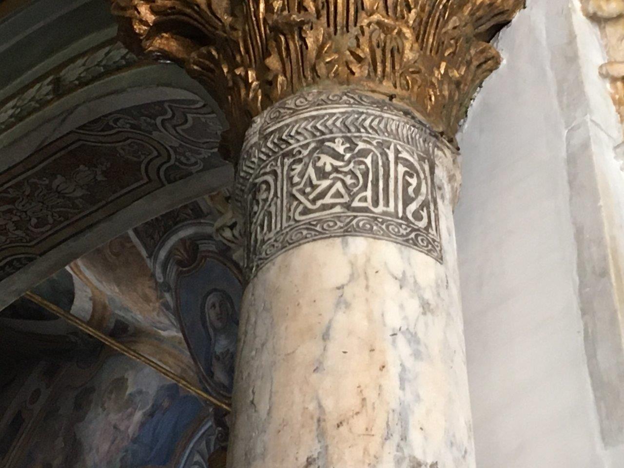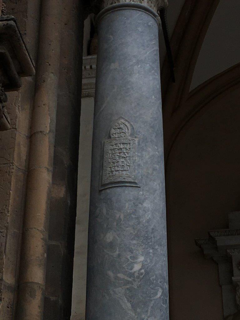 A column by the entrance of Palermo cathedral with a Qur'anic inscription. Probably repurposed from an old mosque in the area because monolithic columns were expensive.