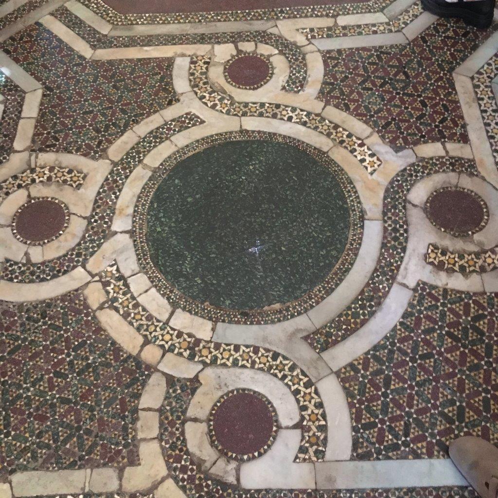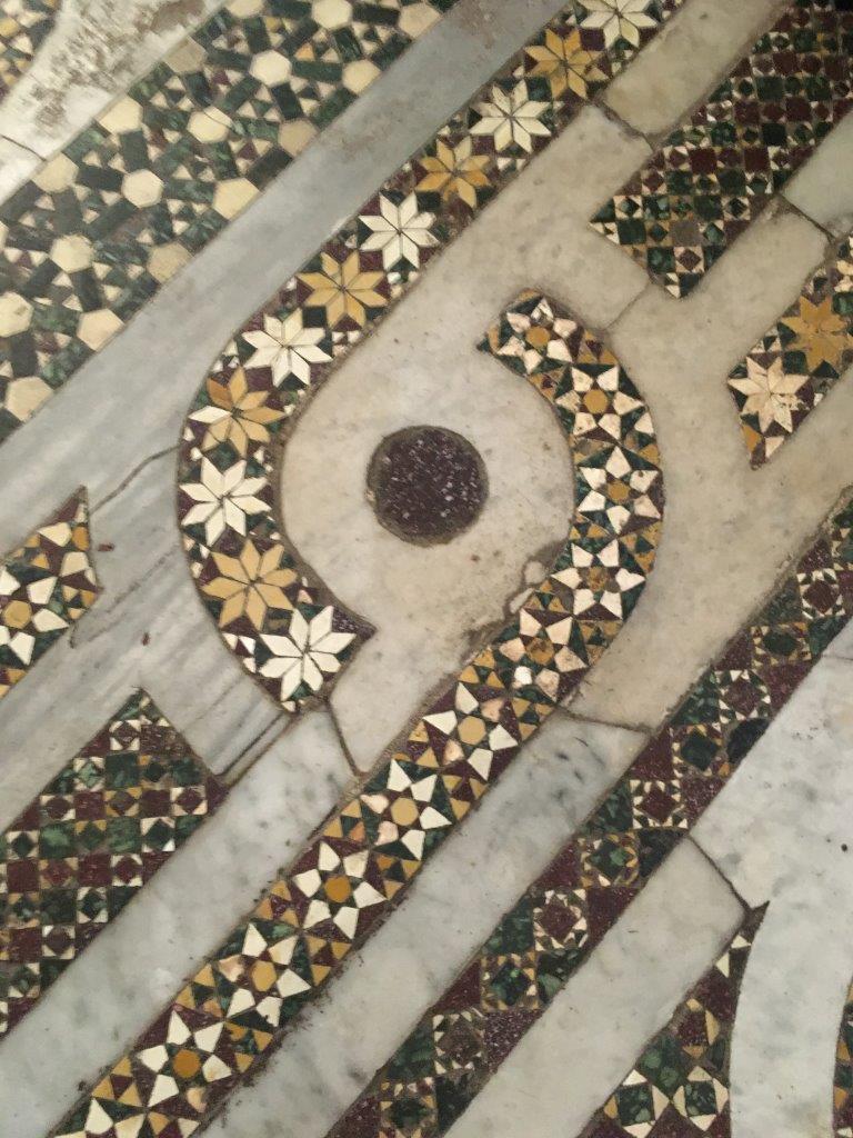 The floor of La Martorana. San Cataldo and the Cappella Palatina look the same, with the Arabic style mosaic. Evidently medieval people thought marble was hardened water! So the floor mosaics could be thought of as rivers and tributaries cutting through the fields of flowers, forests, etc.