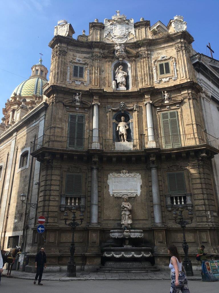The main crossroads on the walking street, Via Maqueda, where we stayed. It's called the Quattro Canti. There are four of these imposing buildings surrounding you when you stand in the center of the intersection.