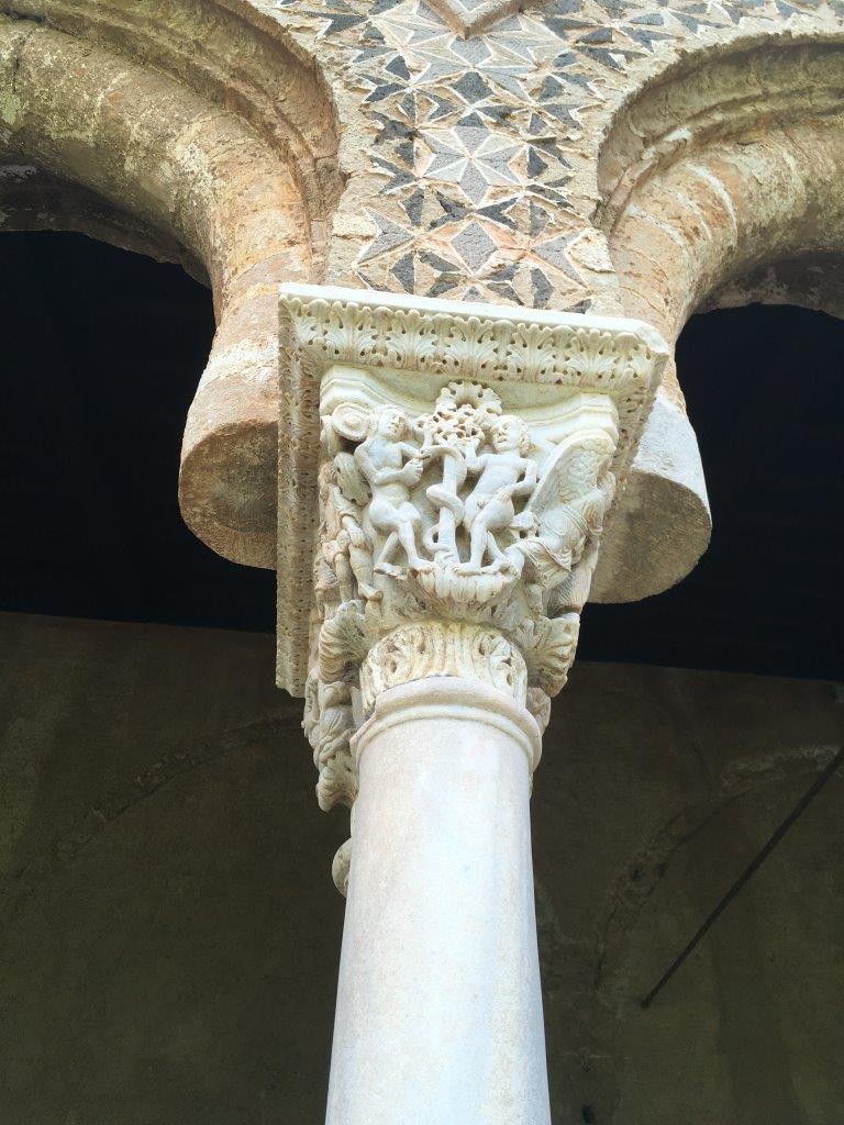 More interesting column tops! This time in the cloister walkway, giving the passerby something to ponder. This one actually has a small model of the whole church and is like a donation plaque.