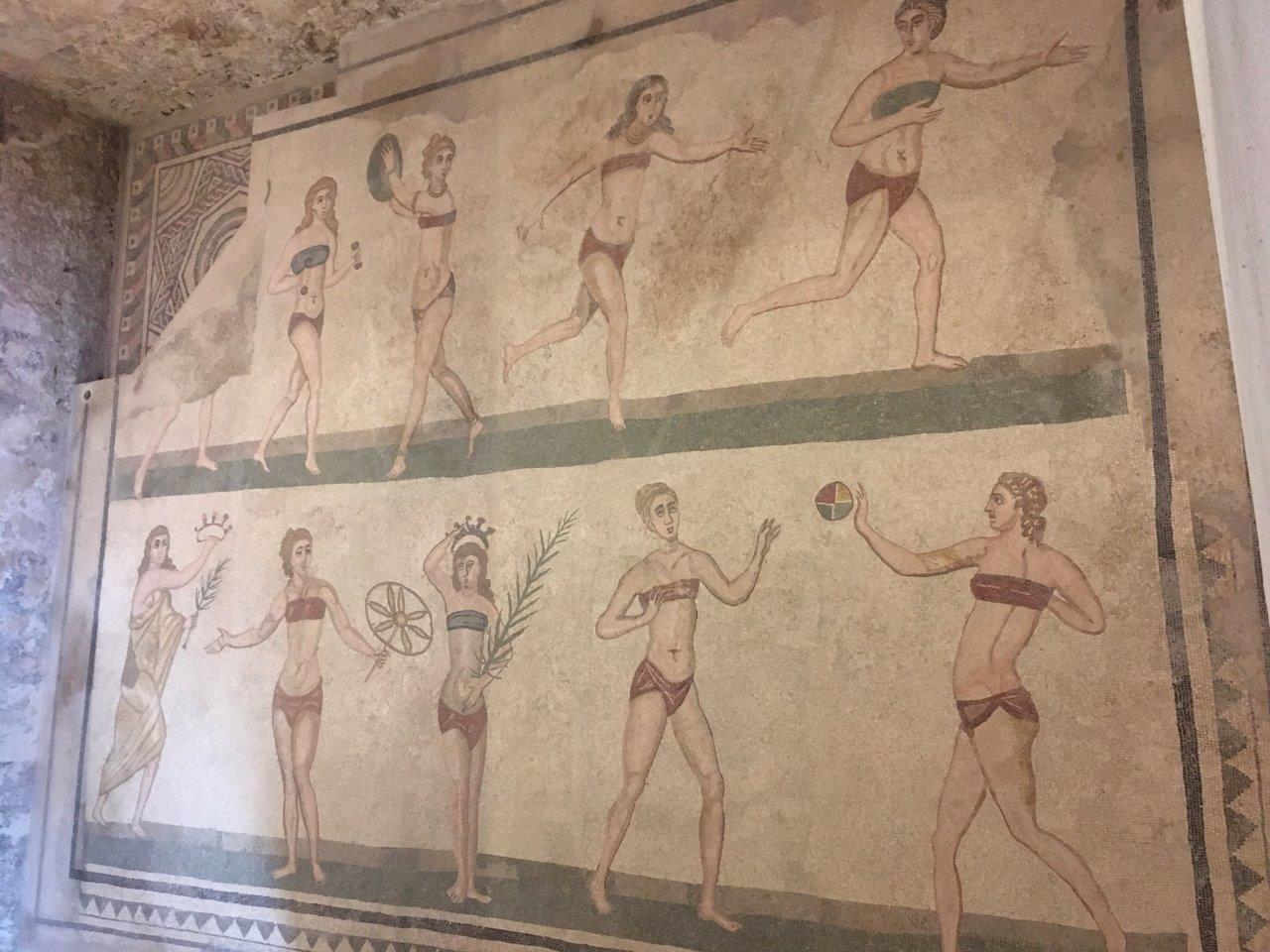 These floors were covered in mosaics, and this is the "Bikini Lady" room. But it's not a bathroom! They're elite women playing in the Olympics!!