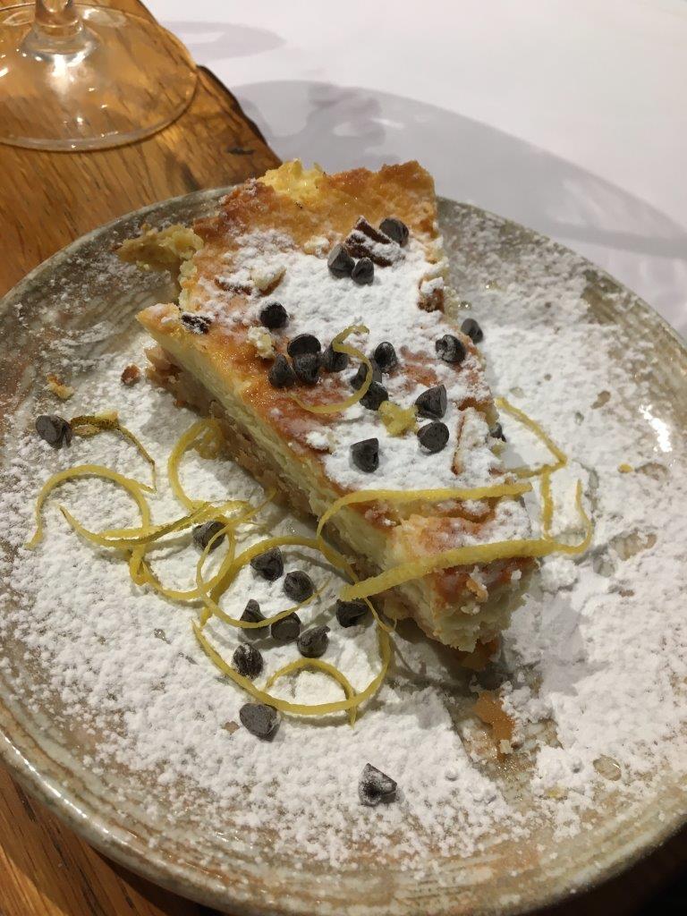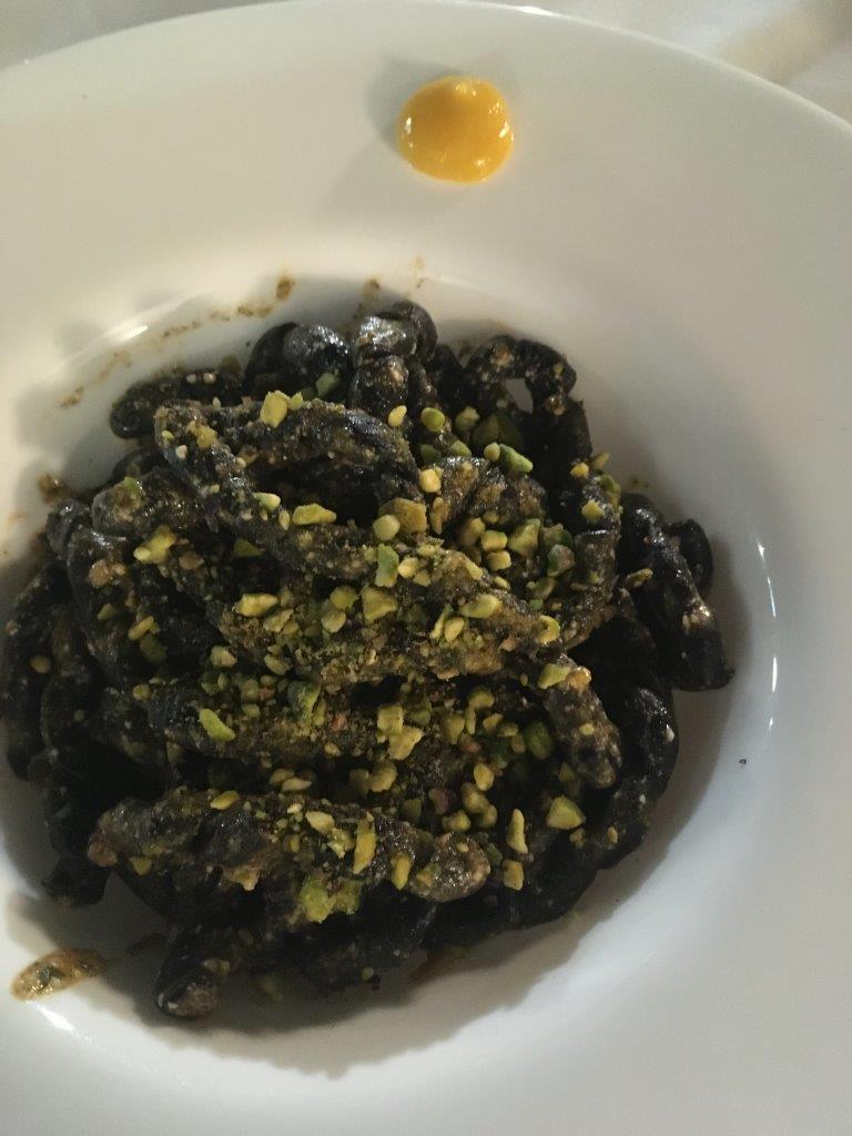 Shrimp pasta with squid ink ricotta sauce, topped with pistachios, that dot of sugarless lemon curd is the chef being creative not giving you a lemon wedge