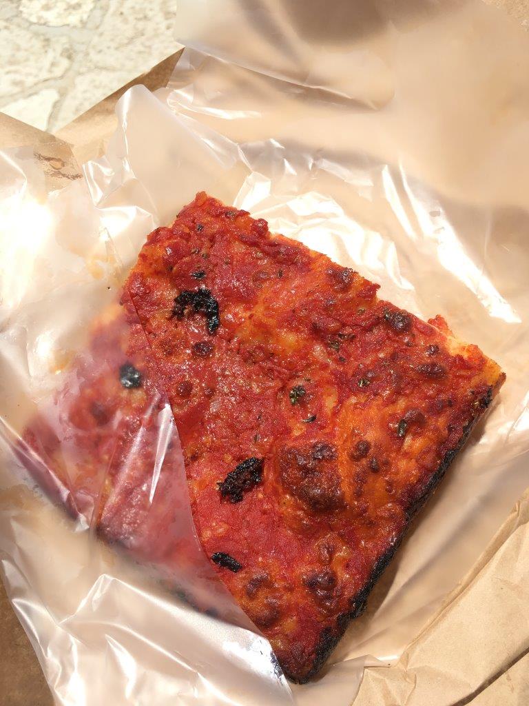 Sfincione, or foccacia-style pizza with anchovies and onion sauce. There may also be some grated cheese and breadcrumbs in other versions, but it was interesting to have pizza that was so flavorful without being covered in mozzarella.