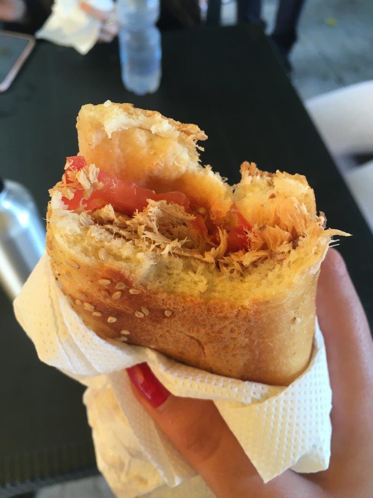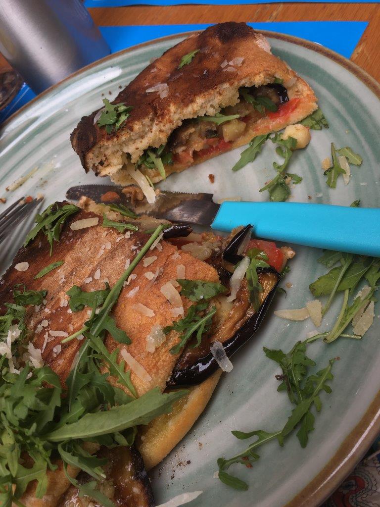 Sandwich on pizza dough with eggplant, primosale cheese, tomato and arugula. One of the best things I ate.