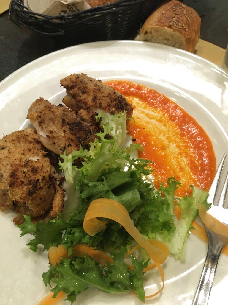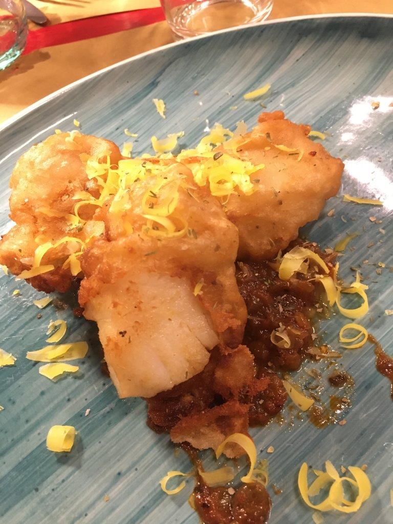 Fried salt cod (baccala) on sfincione sauce with lemon peel. My parents tell stories of their parents soaking, draining, re-soaking, draining again the baccala on Christmas Eve for the Feast of Seven Fishes