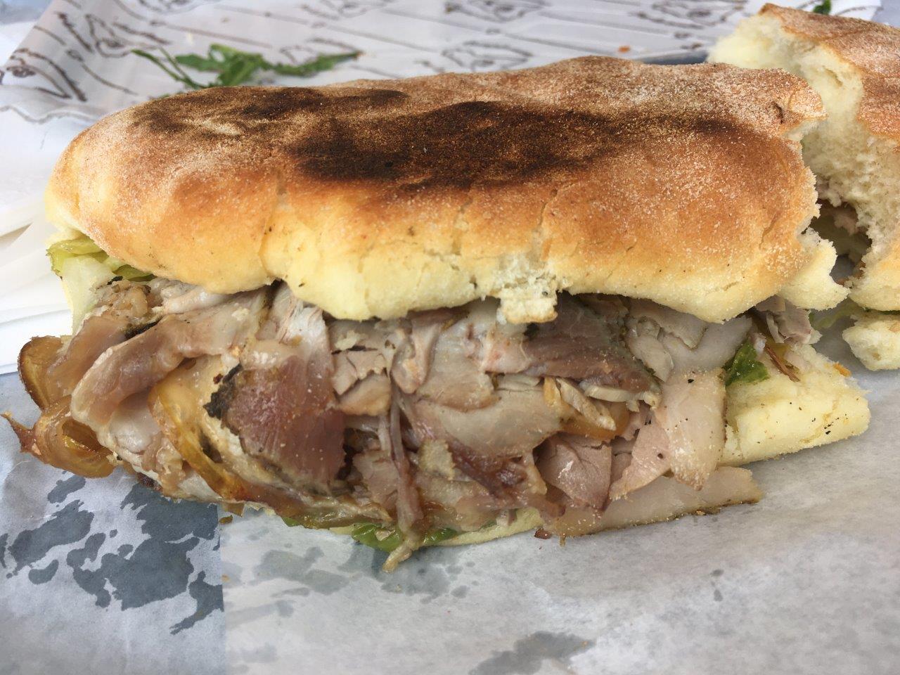 Porchetta sandwich. Porchetta is pork that's been rolled up with other seasonings before being sliced