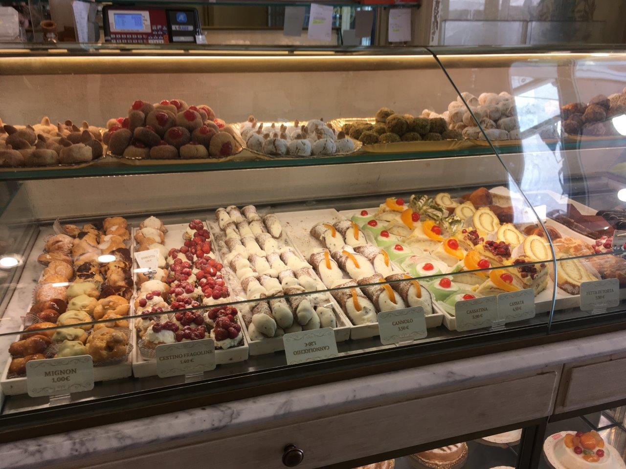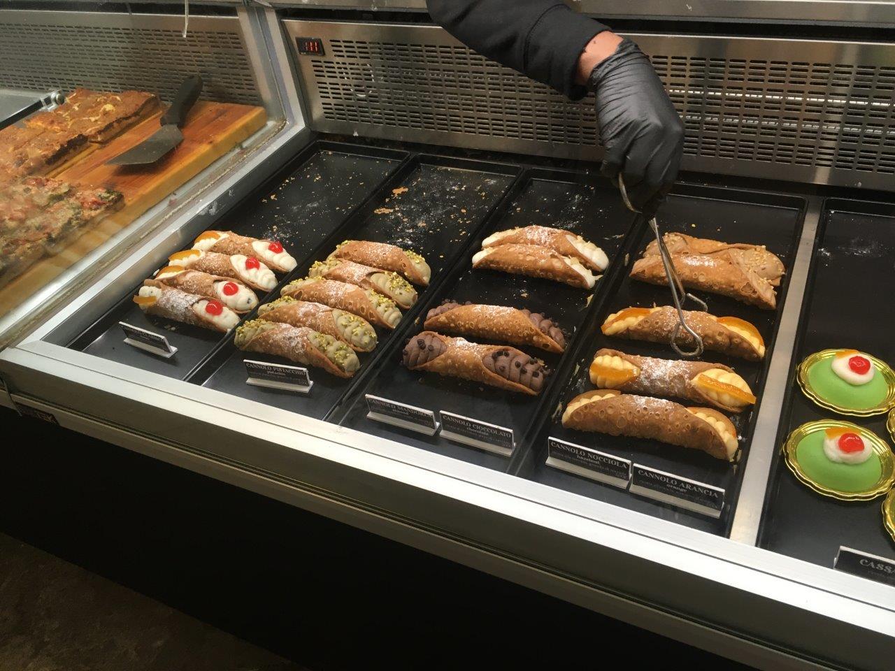 Cannoli with orange or hazelnut filling! You see those green cakes? Cassatina. I guess some saint was martyred by having her chest cut off, and, yeah that's how they remember/honor her.