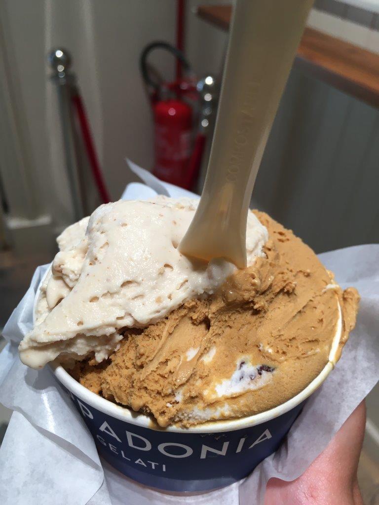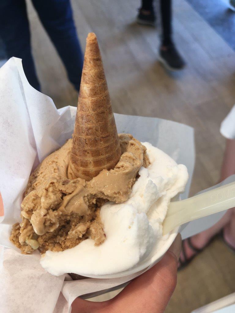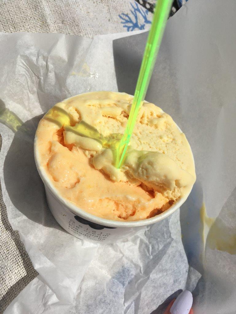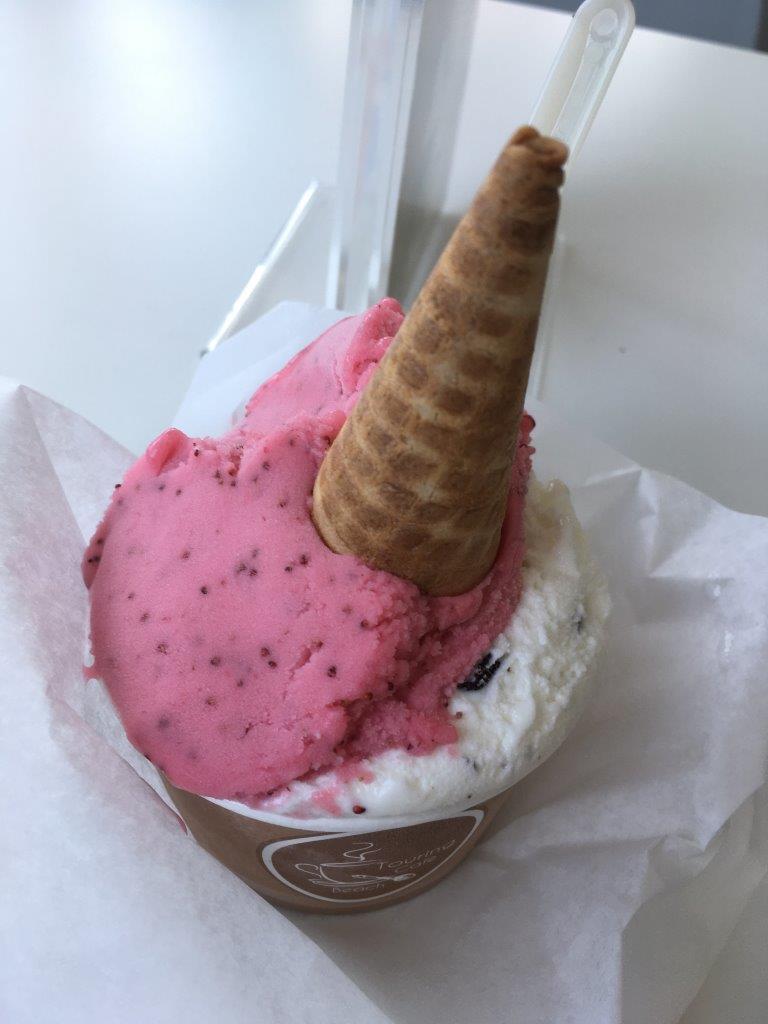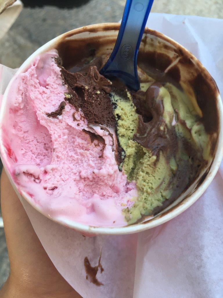 Strawberry and stracciatella, which is like vanilla chocolate chip except the chocolate is in shavings so it's not as hard/hard to chew