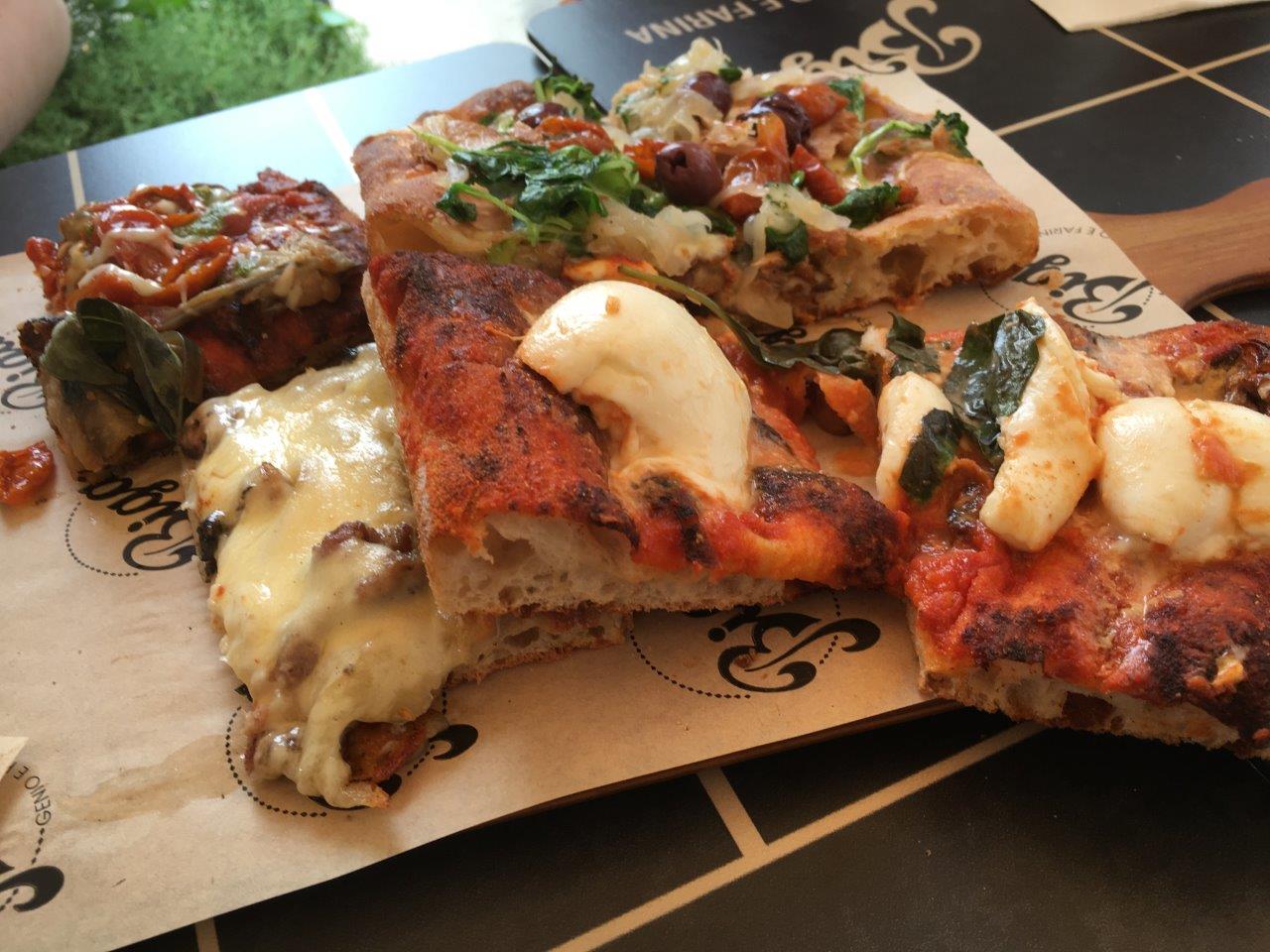 Marguerite pizza, pizza with sausage and potato, pizza with olives/artichokes/argula...