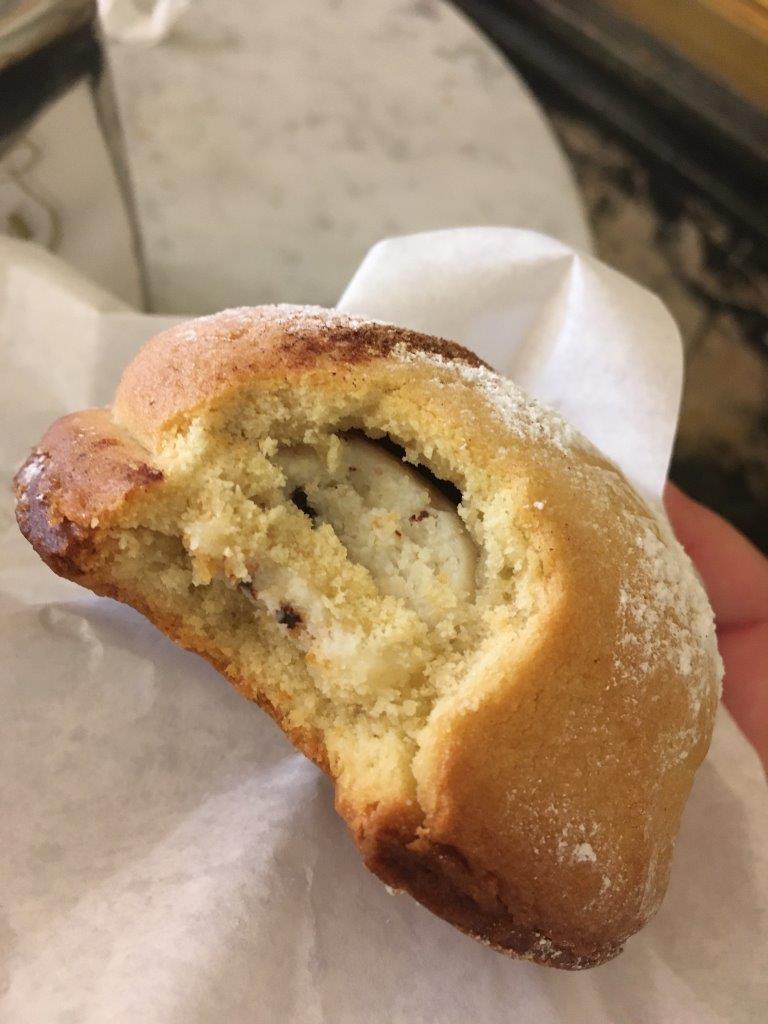 A Genovese cookie. It was really heavy, filled with chocolate chip ricotta cannoli cream. But cannoli shells are light and crisp; this was very dense and not particularly buttery or sweet. Would not recommend, just buy a cannolo.