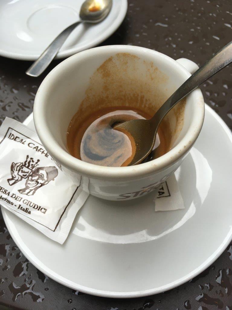 I drink coffee occasionally because America turns it into milkshakes, with whipped cream and chocolate sauce and blended granita ice. But espresso with nothing in it but sugar was enjoyable for just a couple sips. That's all you get; they don't have giant cups of coffee like America. If you ask for a latte, which means milk, they're going to give you milk.
