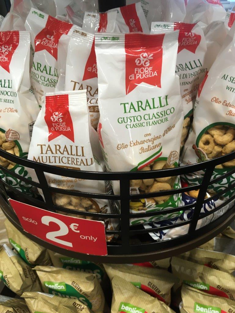 My mom loves tarals, which is how Italian Americans say it. We always thought Italians cut off the last syllable of some words, but nope, that's like an immigrant/Spanglish thing. Anyway, crackers flavored with fennel or in this case, oregano, olive oil, sundried tomato.
