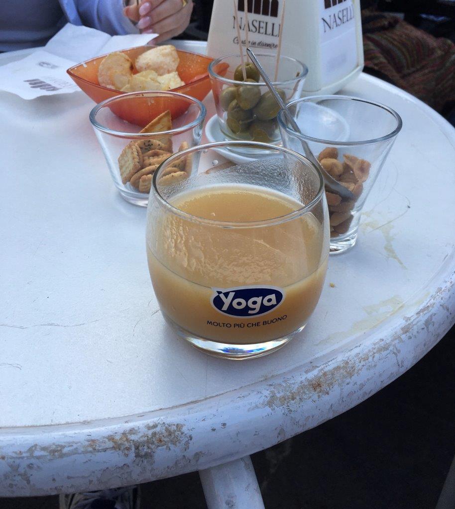 Italian aperitivo: before or after dinner, a drink and small snack of olives, nuts, potato chips, and crackers. I don't drink so I got pear juice :)